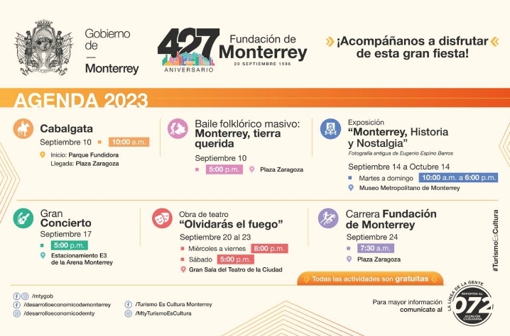 Con un concierto, baile, cabalgata, carrera deportiva, exposiciones y una obra de teatro, el Gobierno de Monterrey estará celebrando el 427 Aniversario de la Fundación de la ciudad.
