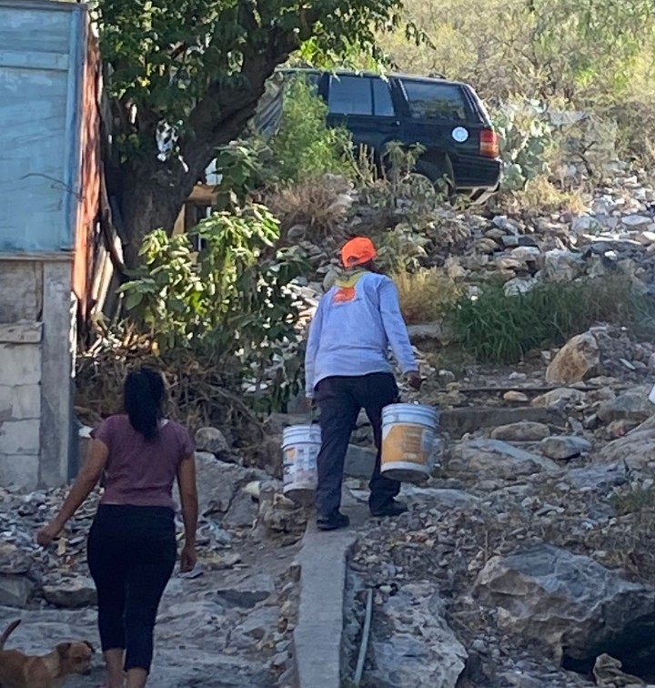Personal del área de Juventud ayuda a los vecinos del sector Lomas del Mirador a llevar cubetas con agua hasta sus hogares, tras abastecerse del vital líquido de pipas que envía el Municipio cerca de la colonia.