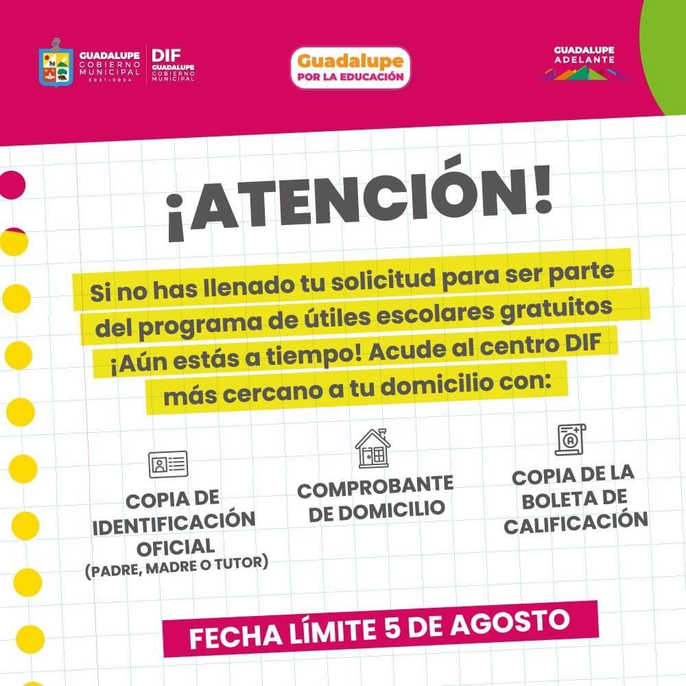Por su parte, Tomás Montoya, mencionó que aquellos alumnos que no entregaron sus solicitudes pueden acudir hasta el 5 de agosto a cualquiera de los 29 Centros DIF de Guadalupe, en un horario de 9 de la mañana a 5 de la tarde.