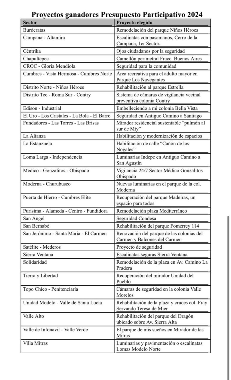Para conocer los proyectos ganadores, puedes visitar: https://decidimos.monterrey.gob.mx/processes/presupuesto-participativo-2024/f/159/