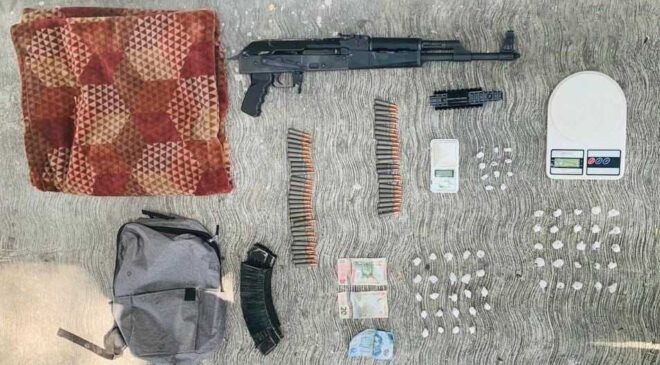 A los presuntos infractores se les solicitó una revisión precautoria, de la cual se obtuvo el aseguramiento de: un arma larga con su cargador con 24 balas; un cargador con 30 municiones; una cobija; dos básculas digitales; 11 envoltorios con una sustancia sólida en color blanco con las características de la cocaína en piedra; 49 envoltorios de una sustancia sólida parecida a la droga conocida como “cristal”, y una mochila gris.