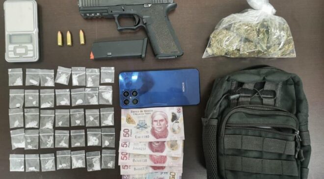 Debido a esto, los policías le marcaron el alto y le solicitaron una revisión precautoria. El hombre se identificó como Pablo “N”, de 37 años de edad y se le decomisaron los siguiente objetos: una bolsa con hierba verde y seca con las características de la marihuana, una mochila, un arma corta con su cargador y tres balas, 35 de una sustancia parecida al cristal, dinero en efectivo, un celular y una báscula digital.