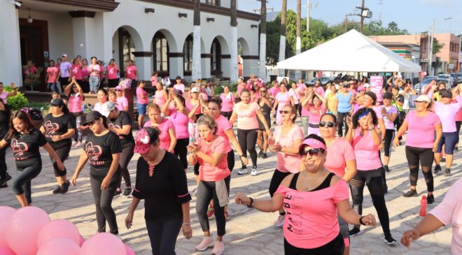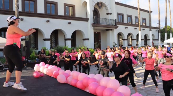 Con el objetivo de promocionar programas de atención para mujeres que padecen cáncer de mama, así como acciones para la prevención de esa enfermedad, el DIF de Escobedo realizó una “Zumba Rosa” en la explanada de la Presidencia Municipal.
