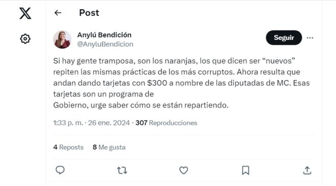 Y agregó: “Ahora resulta que andan dando tarjetas con $300 a nombre de las diputadas de MC”.