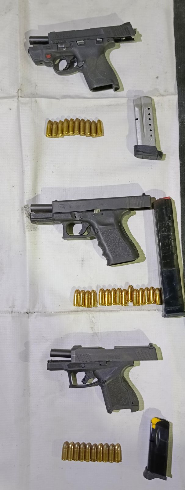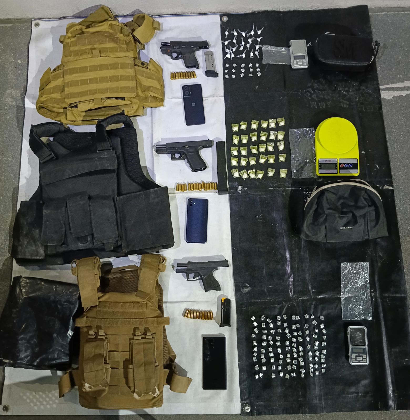 Tres armas cortas abastecidas con 35 balas; tres chalecos balísticos; 115 envoltorios con una sustancia sólida parecida a la cocaína en piedra; 50 con cocaína en polvo y dinero en efectivo.