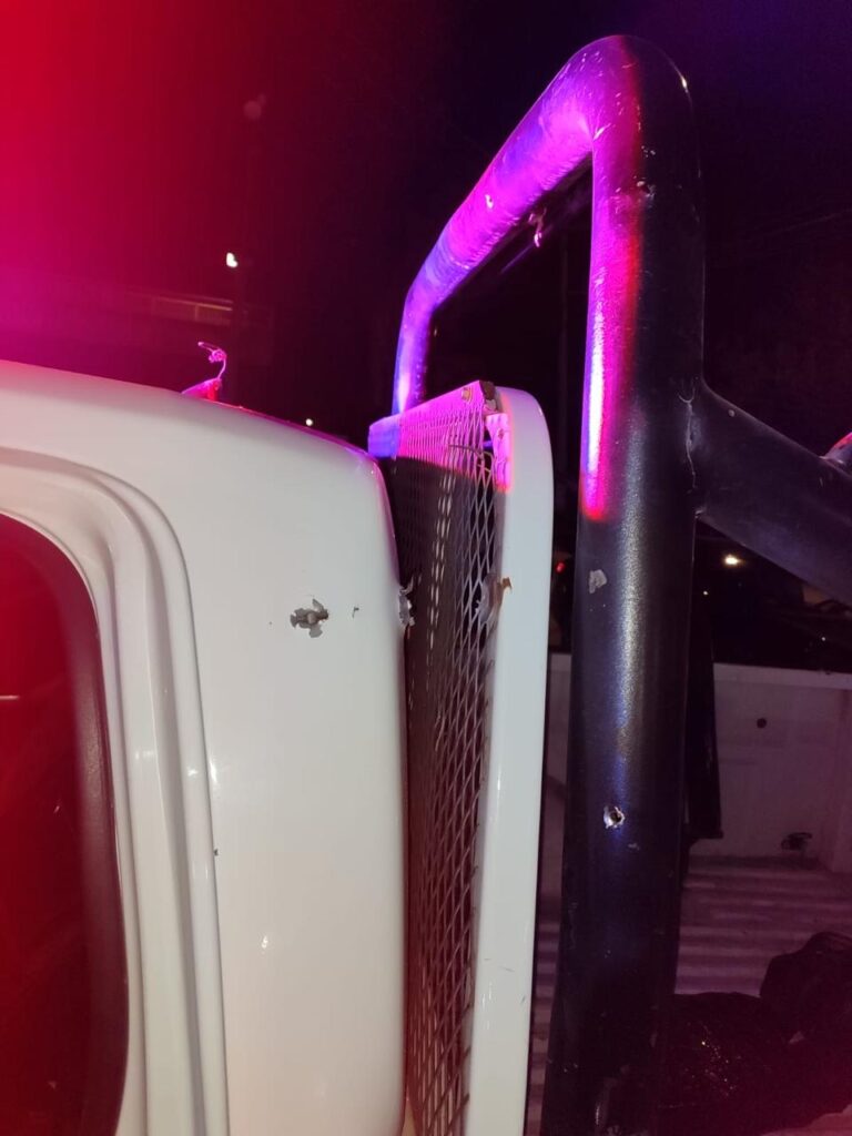 Mientras que una patrulla resultó con impactos de arma larga en el lado del acompañante, parte trasera y cristales.