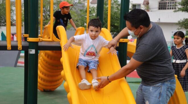 La Presidenta Municipal explicó que algunos de los materiales que se utilizaron para la construcción del Ecoparque son reciclables, como los troncos del área lúdica, que son restos de sabinos que se derrumbaron con las lluvias del huracán Hanna.