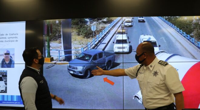 Después, con este sistema vanguardista con una configuración de “Video Wall” de cámaras de vigilancia que funcionan las 24 horas del día, se detectó que los 4 presuntos delincuentes a bordo del vehículo Jetta color blanco iban escoltando la camioneta robada con rumbo de Santa Catarina hacia el estado de Coahuila, donde fueron capturados junto con los dos vehículos y un arma de fuego en posesión de esta banda de “roba coches”.