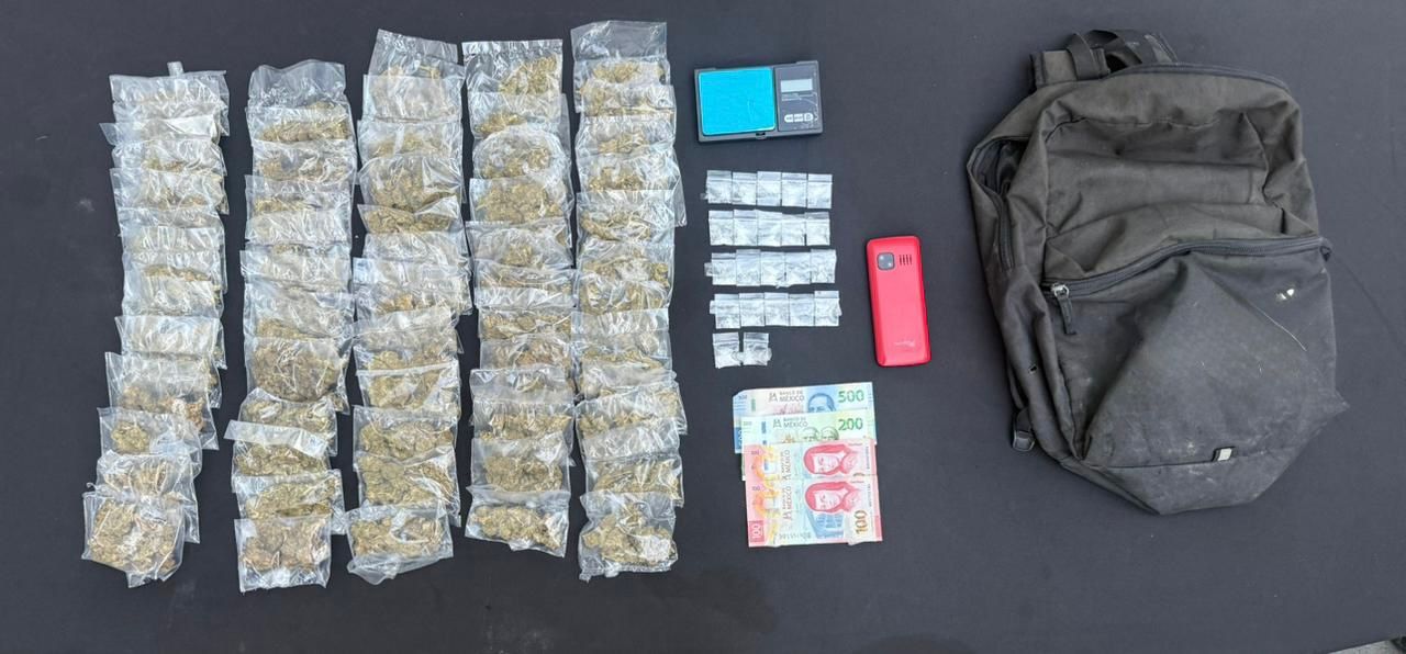 La persona fue identificada como Oswaldo “N”, de 31 años de edad y le incautaron 61 envoltorios con hierba verde y seca con las características de la marihuana, 22 bolsas tipo ziploc, 900 pesos en efectivo, una báscula digital y un celular.