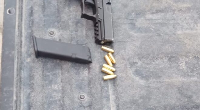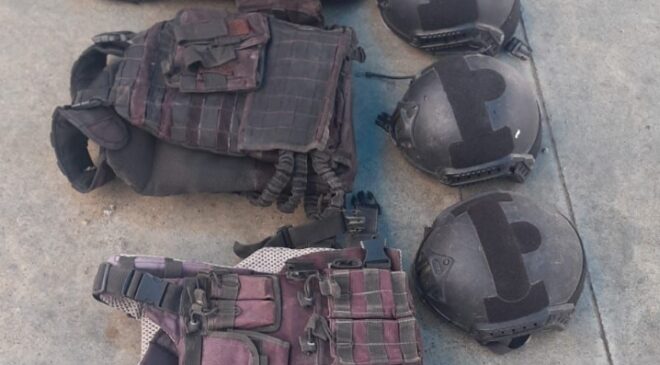 Los objetos asegurados fueron: dos armas de fuego calibre .9mm, dos cargadores abastecidos; 36 envoltorios de plástico con una sustancia parecida a la droga “cristal”; bolsas pequeñas que contenían hierba verde y seca con las características de la marihuana; dinero en efectivo, chalecos y cascos balísticos; así como una báscula gramera, y el vehículo.