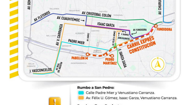 Monterrey, Nuevo León.- El Gobierno del Estado, a través de la Secretaría de Movilidad y Planeación Urbana y el Sistema de Transporte Colectivo Metrorrey, anunció el cierre temporal del carril exprés de la avenida Constitución desde su cruce con la avenida Cristóbal Colón, hasta la altura de la avenida Benito Juárez (Pabellón M), en el Centro de Monterrey.