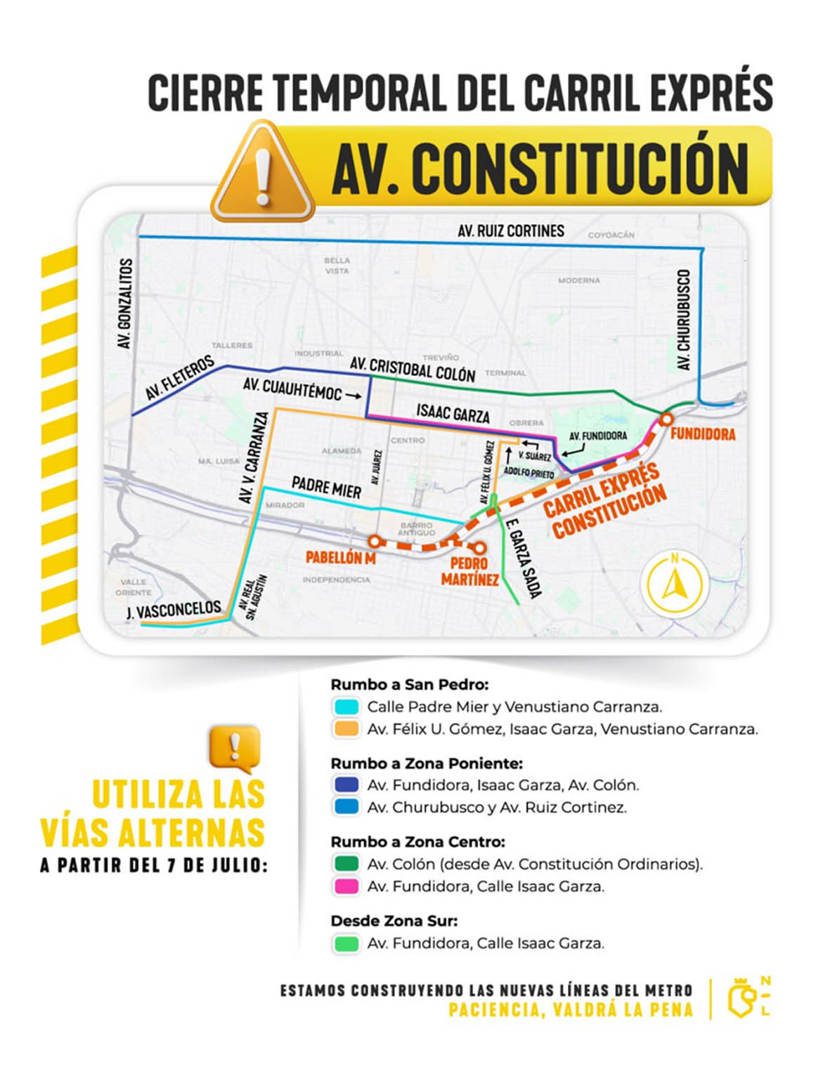 Durante el Nuevo León Informa del pasado 5 de julio, las autoridades dieron a conocer las alternativas viales para la circulación en la zona centro, zona poniente, zona San Pedro y zona sur, con el fin de reducir la afectación a la población durante sus trayectos.