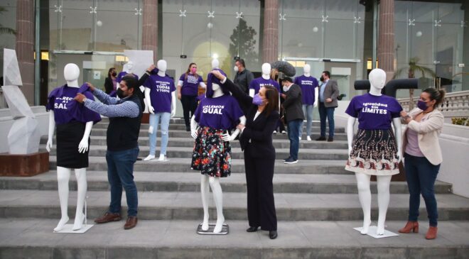 En las escalinatas del Museo de Guadalupe, se inauguró el Corredor de la Igualdad, donde se colocaron maniquíes, a los que se les colocaron playeras en color morado, con las frases: “Ni más, ni menos, iguales”; “Educación para todas y todos”; “Igualdad Salarial”; “Igualdad sin límites”; “Derecho a la Salud”; que permitirán a la sociedad reflexionar sobre la importancia de tener una igualdad real y palpable a favor de las mujeres.