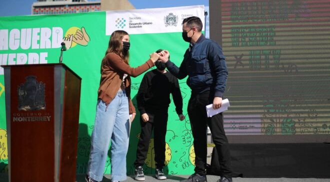 Pero destacó el mensaje de la adolescente de 14 años de edad, María Sánchez del Bosque, representante del Comité Climático Juvenil de Monterrey, quien manifestó su preocupación de que, al llegar a la edad adulta, ya no haya agua, ni se pueda respirar, y cuestionó al Munícipe si entraría al reto de tomar medidas para generar un medio ambiente sano, quien aceptó y sellaron el pacto cruzando sus respectivos dedos meñiques.