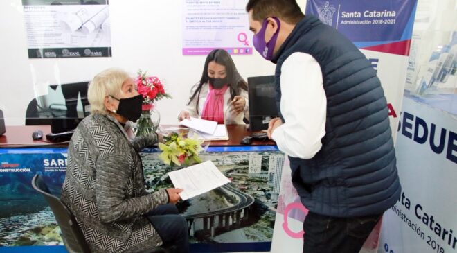 El Encargado del Despacho de los Asuntos de la Presidencia Municipal de Santa Catarina, Héctor Urquidi Tamiatti, supervisó muy temprano los trámites que realizaron usuarias en la “Ventanilla Rosa”, siguiendo los debidos protocolos sanitarios, para constatar trámites de permisos de obra nueva , ampliación o regularización de construcción de casa habitación, número oficial, formalización de la instalación de un comercio de barrio.