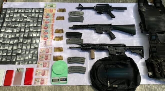 A los siete se les solicitó una revisión precautoria en sus pertenencias en las que se encontraron e incautaron: una mochila, dos chalecos balísticos, tres armas largas, seis cargadores y 60 municiones; 129 dosis de una sustancia parecida a la droga denominada “cristal”; cinco celulares, una báscula digital y mil 100 pesos en efectivo.