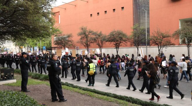 En el operativo de seguridad tanto para la comunidad en general como para las manifestantes, participan elementos estatales de Fuerza Civil y Policía Ministerial, así como de Bomberos y de Protección Civil de Nuevo León y municipal.