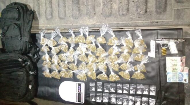 Por esta razón se les solicitó una revisión precautoria a sus pertenencias, encontrando dinero en efectivo, 50 envoltorios con hierba verde y seca con las características de la marihuana, 20 envoltorios con una sustancia sólida y cristalina parecida al cristal; además de un arma corta con cartuchos hábiles calibre 9mm.