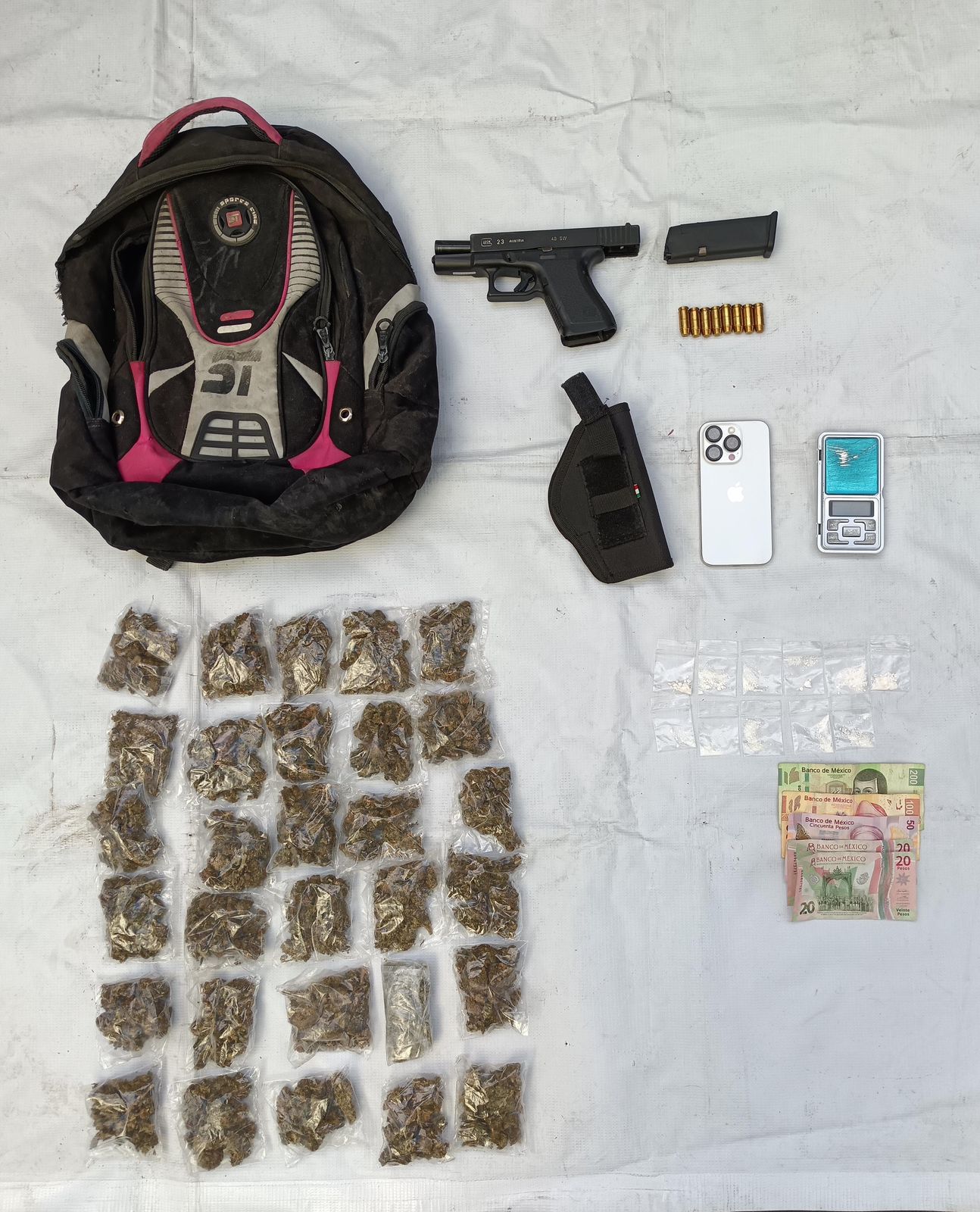 Su aprehensión se registró en la colonia Jardines de Casa Blanca, en el municipio de Guadalupe. Le decomisaron un arma de fuego corta abastecida, de uso exclusivo del Ejército; una funda del arma, 41 dosis de droga, entre otros objetos.