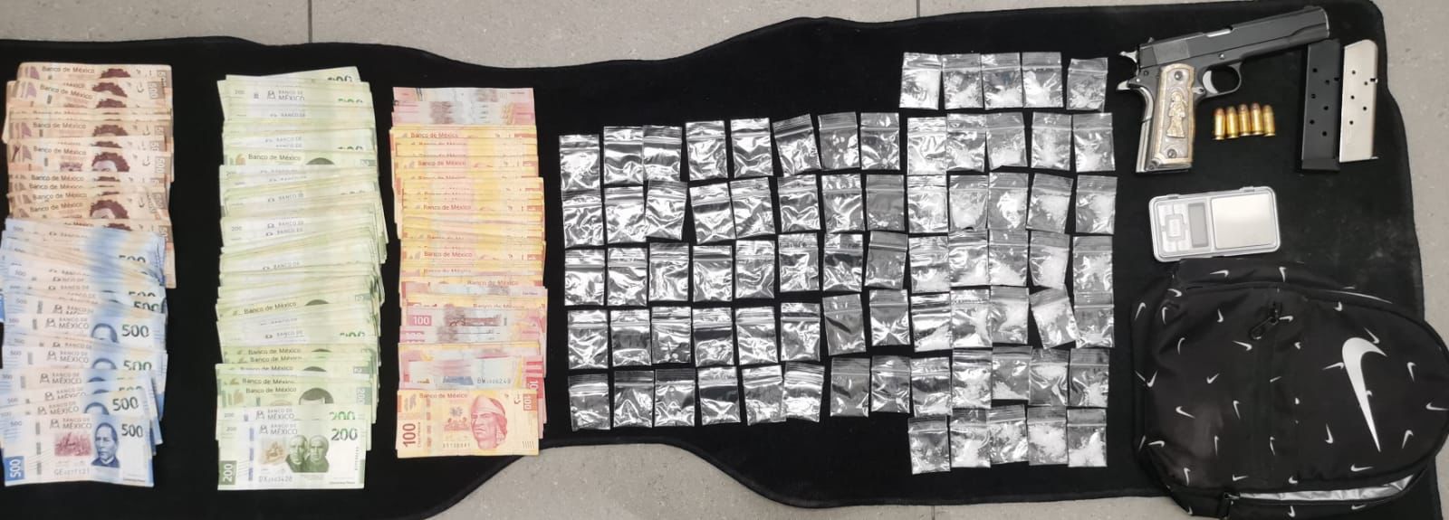 La persona se identificó como Christian “N”, de 29 años de edad, a quien se le solicitó una revisión precautoria a sus pertenencias, resultando en el decomiso de los siguientes objetos: un arma de fuego corta, una mochila que contenía 35 envoltorios de una sustancia parecida al cristal, 40 dosis de una sustancia sólida similar a la cocaína en piedra, un báscula digital y 47 mil pesos en efectivo.