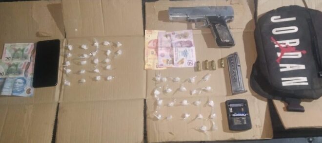 Por este motivo, los policías les solicitaron una revisión precautoria a sus pertenencias, encontrando lo siguiente: una bandolera, 44 envoltorios con una sustancia similar a la droga conocida como “cristal”, un arma con su cargador y cuatro municiones, una báscula digital, dinero en efectivo y un celular.