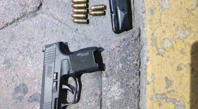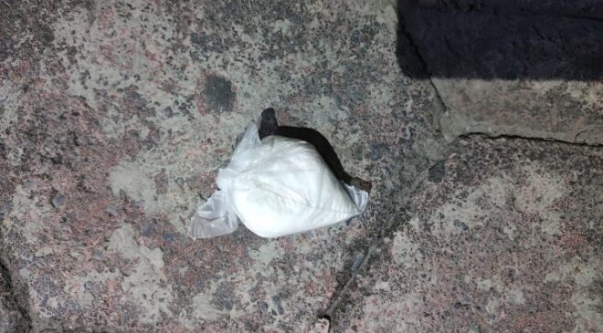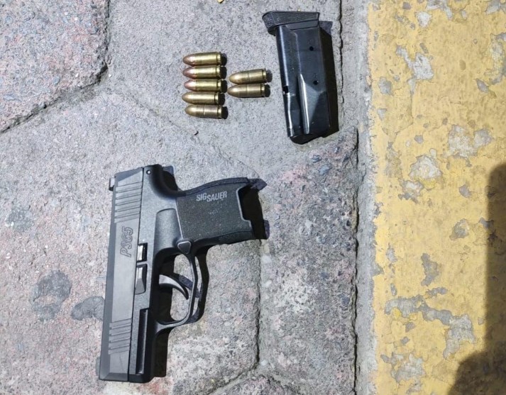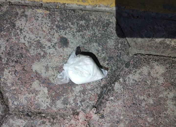 Debido a que dicha actitud continuó, se procedió a realizarle una revisión, encontrándole entre sus pertenencias una arma corta calibre .9mm y una bolsa transparente que contenía polvo blanco con las características de la cocaína.