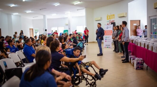 Durante la entrega de mil 666 complementos nutricionales, Tomás Montoya resaltó que además, se han otorgado 16 sillas de ruedas especiales para niñas y niños con parálisis cerebral infantil y aparatos ortopédicos.