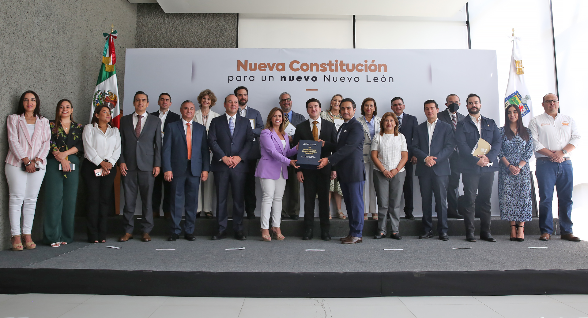 Acompañado del grupo de expertas y expertos que participaron en los cuatro conversatorios de la Nueva Constitución, el Gobernador Samuel Alejandro García Sepúlveda entregó el proyecto al Congreso del Estado, que fue aprobado en primera vuelta por las Diputadas y Diputados.