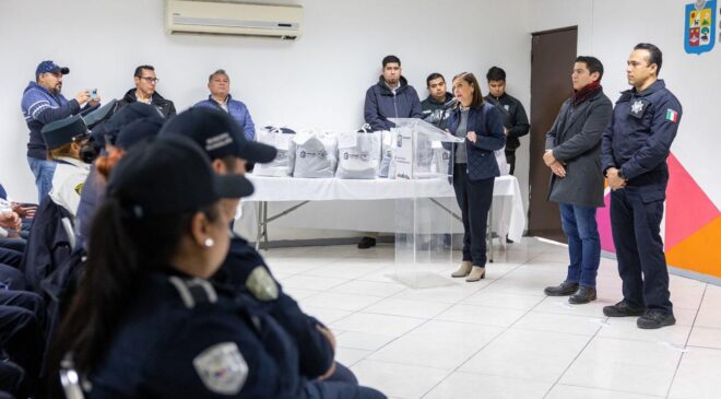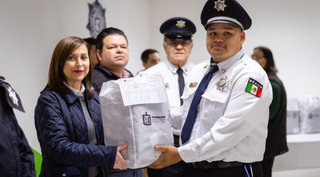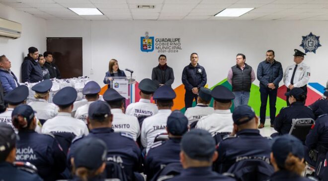 Al equiparlos con mejores herramientas de trabajo, la Alcaldesa Cristina Díaz entregó uniformes a elementos de Policía y Tránsito, de la Secretaría de Seguridad Pública y Protección Ciudadana de Guadalupe.