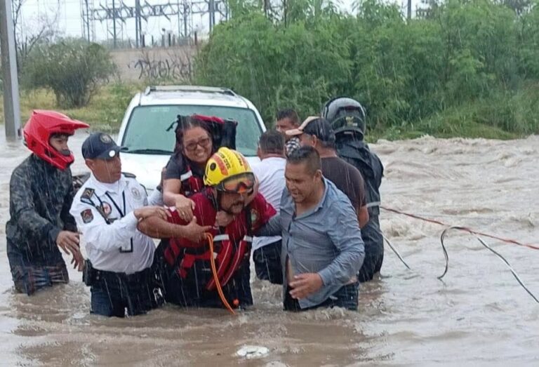 En este punto el personal de Protección Civil se dio a la tarea de usar cuerdas para remolcar el vehículo y sacarlo de inmediato para luego trasladarlo a una zona segura. De igual manera hicieron acto de presencia en las márgenes del Arroyo Potrerillos donde el agua rebasó el nivel del puente y se desbordó, por lo cual estuvieron desviando el tráfico a otra avenidas y calles.