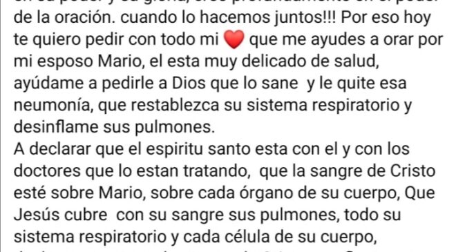 Hizo un llamado a familiares, amigos y a la ciudadanía en general para que se unan en oración a fin de que su esposo pueda sanar y no se agrave su estado de salud.