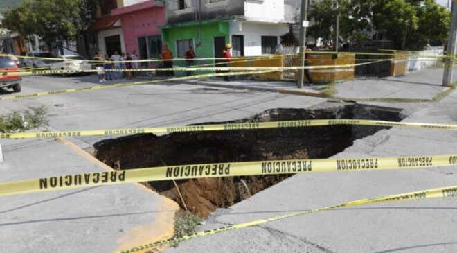 Tras la formación de un socavón en el cruce de las calles Santiago Roel y San Jacinto, en la colonia Santa Lucía, el municipio de Escobedo informa que en coordinación con Agua y Drenaje de Monterrey (AyD) iniciará la evaluación de la zona afectada para determinar las causas que ocasionaron el hundimiento y daños a la carpeta asfáltica y tuberías.