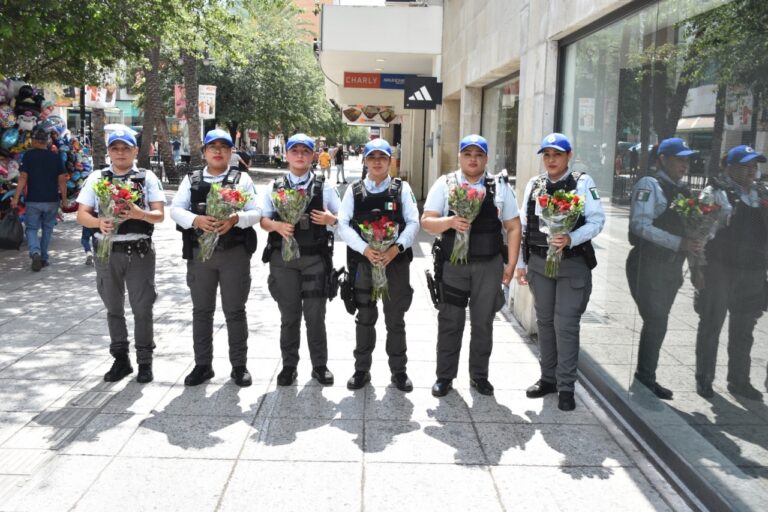 Mujeres oficiales de la Policía de Monterrey entregaron flores a las madres de familia durante este sábado 10 de mayo, en el centro de la ciudad.