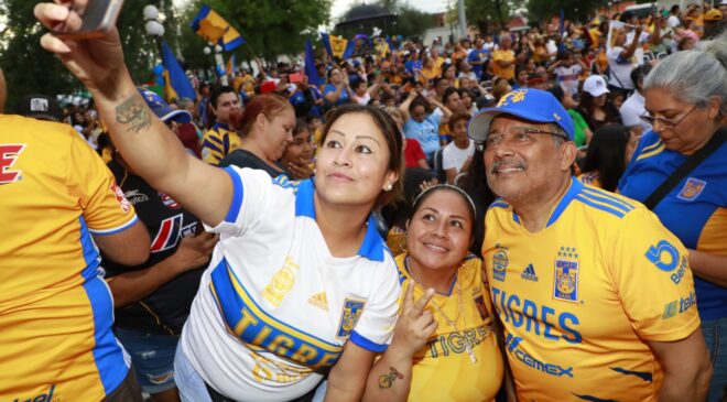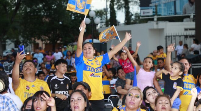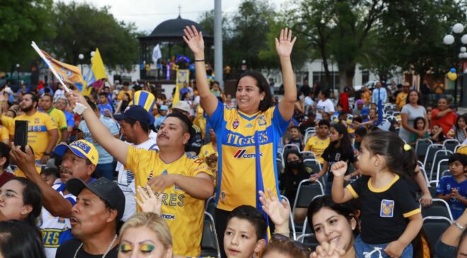 Horas antes de que arrancara el partido, decenas de cientos de familias comenzaron a pintar de amarillo y azul la Plaza Principal, donde a través de una mega pantalla colocada en un escenario, disfrutaron cada minuto con la transmisión de la final Tigres contra Chivas.