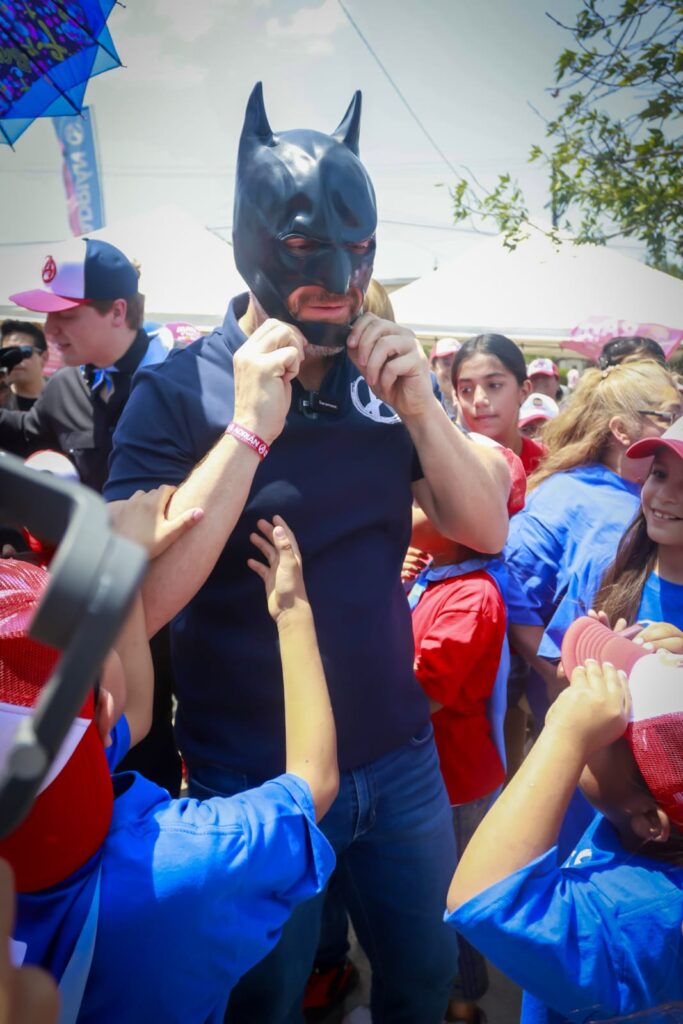 En la fiesta para los niños el candidato, su familia y equipo convivieron con ellos, jugaron, repartieron regalos y a petición de uno de los asistentes, De la Garza utilizó la máscara de Batman, lo cual fue vitoreado por los niños y sus madres que, a su parecer, lucía como un verdadero superhéroe.