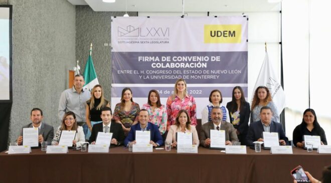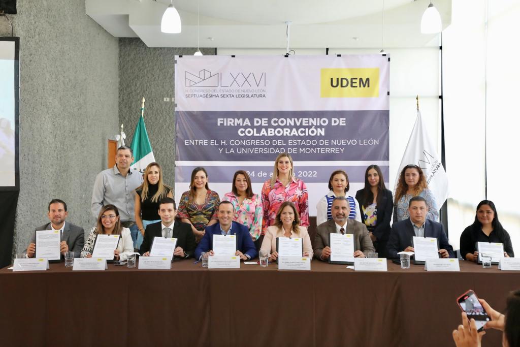 El Congreso del Estado de Nuevo León y la Universidad de Monterrey firmaron un convenio de colaboración para fomentar el Parlamento Abierto a través de capacitación, intercambio de experiencias, preparación académica y que estudiantes de la Escuela de Derecho y Ciencias Sociales de la UDEM puedan realizar su servicio y prácticas profesionales en el Poder Legislativo.