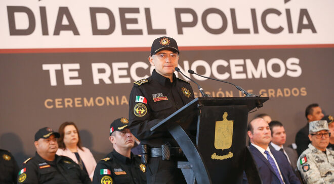 En la conmemoración del Día del Policía, el Gobernador Samuel Alejandro García Sepúlveda, en compañía del Secretario de Seguridad Pública, Gerardo Palacios Pámanes, destacó la labor de las y los elementos de Fuerza Civil, a quienes dijo, elevará sus prestaciones para que mejoren su calidad de vida.