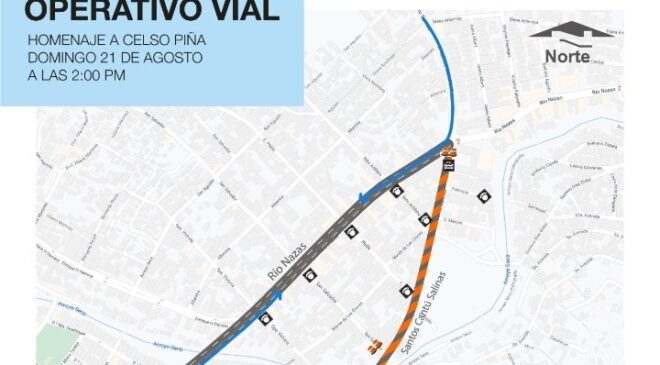 Por la tarde y para la seguridad de los asistentes al homenaje a Celso Piña en la colonia La Campana, se aplicará el cierre vial de la calle Santos Cantú Salinas, desde Camino al Mirador a Río Nazas.