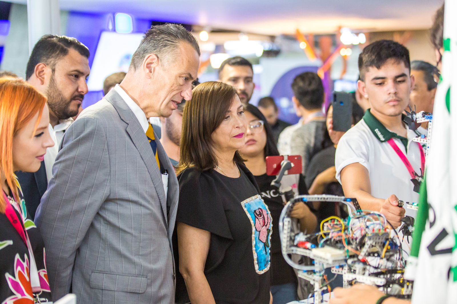 Cristina Díaz recorrió los 27 módulos, donde los jóvenes participantes exhibieron 19 proyectos sobre robótica, inteligencia artificial, drones, seguridad, educación, desarrollo sustentable, visores de realidad virtual, apps, videojuegos, actividades manuales, y prótesis biónica, entre otros.