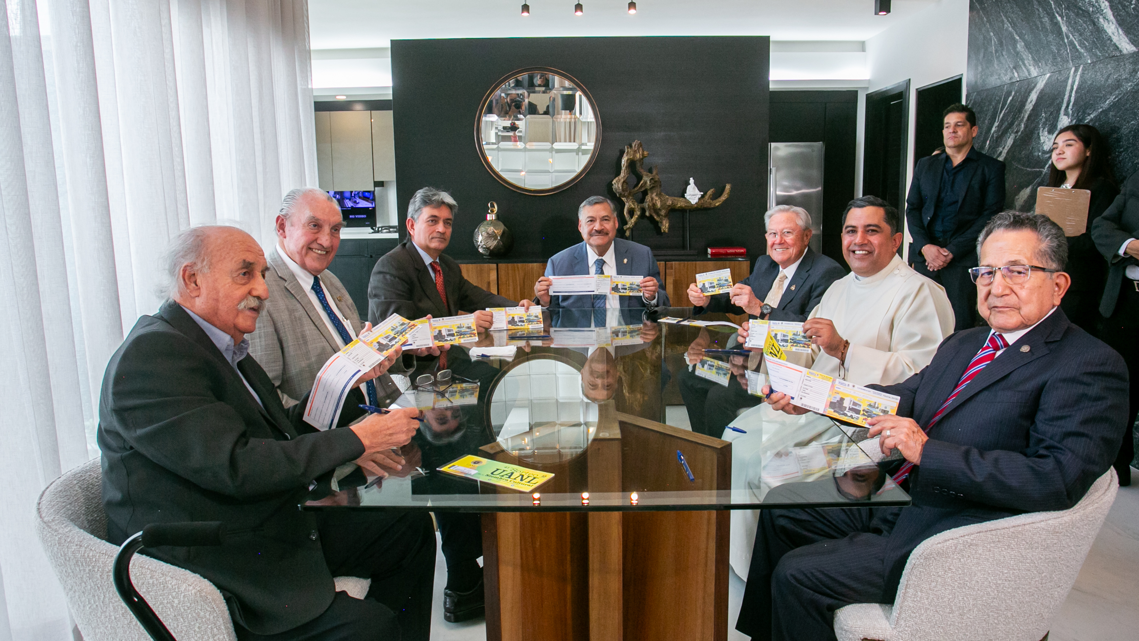 El Rector de la Universidad Autónoma de Nuevo León (UANL), Santos Guzmán López, encabezó el acto y aprovechó para destacar el trabajo que realiza la Fundación UANL al organizar el sorteo en beneficio de los estudiantes y la propia Universidad.