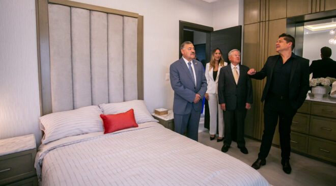 El presidente del Comité de Sorteos de la Siembra Cultural, Othón Welsh Lozano: el presidente de la H. Junta de Gobierno de la UANL, Benjamín Limón Rodríguez; el Secretario General, Juan Paura García, y el Secretario General del STUANL, Rafael Garza Ibarra, acompañaron al Rector en el corte del listón inaugural de la vivienda.