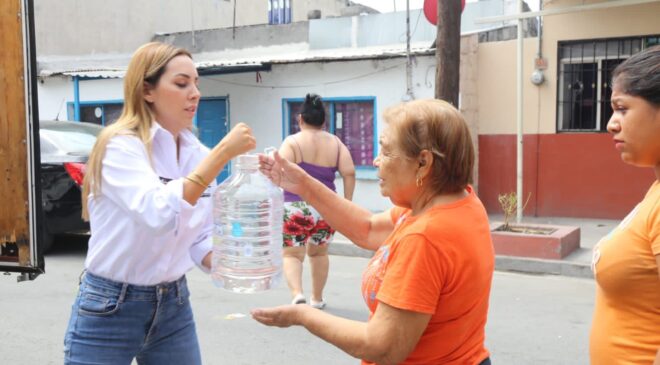 Con el fin de mitigar un poco la falta de agua, la Diputada local del PRI, Perla Villarreal entregó bidones con el vital líquido a los vecinos de las colonias Estrella, Industrial, Talleres e Independencia, en Monterrey.