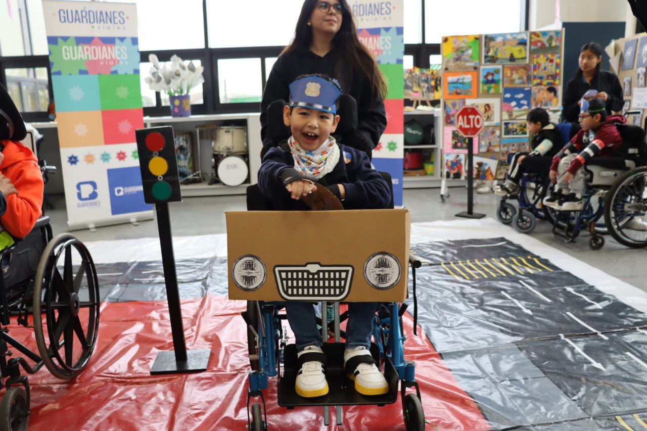 El taller de arte de la institución se convirtió en un espacio de práctica donde niñas y niños con parálisis cerebral participaron en actividades didácticas y recorrieron réplicas de calles en donde atendieron las indicaciones de señalamientos con sus sillas de ruedas disfrazadas como vehículos.
