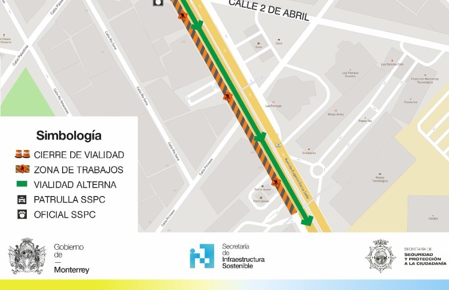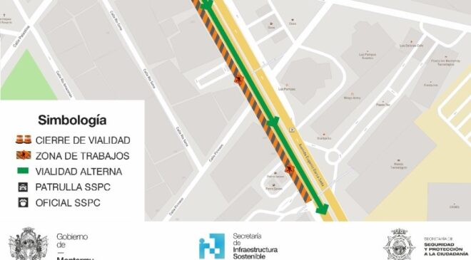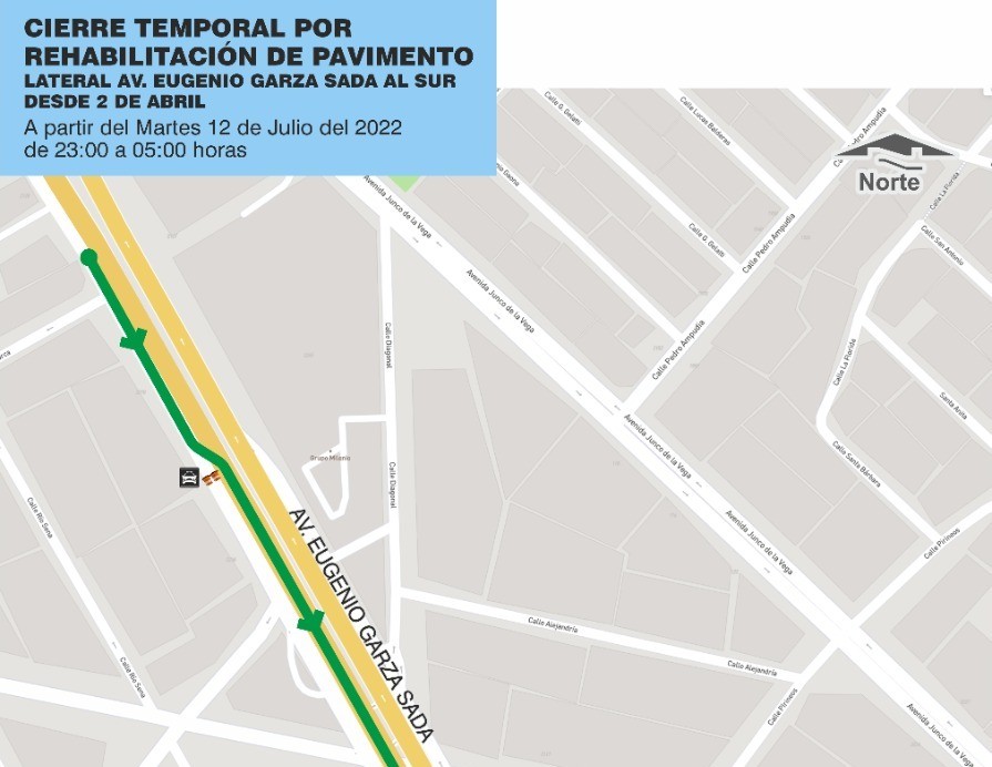 A partir de las 23 horas de este martes, se estarán interviniendo los carriles secundarios (laterales) en el sentido de norte a sur de Eugenio Garza Sada a la altura de la calle 2 de Abril; así como al poniente de Morones Prieto, a la altura de la colonia Balcones del Carmen.