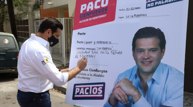 El candidato de la coalición PRI-PRD: “Va Fuerte por Nuevo León”, Paco Cienfuegos, reiteró además su acuerdo para lograr que la vigilancia total en Monterrey quede a cargo de la Policía Municipal a través de un Mando Único, y no como sucede actualmente en dónde el 60% del territorio regio está bajo la jurisdicción de Fuerza Civil.