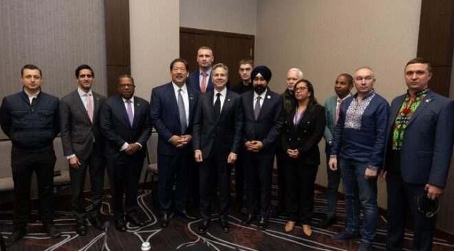 Por la mañana, Colosio Riojas acudió a una reunión del Secretario de Estado Norteamericano con cinco Alcaldes ucranianos que encabezan labores de reconstrucción de su nación y con representantes de las ciudades de Chicago, Seattle y Hoboken; de Winston, Jamaica; y Salvador, Brasil.