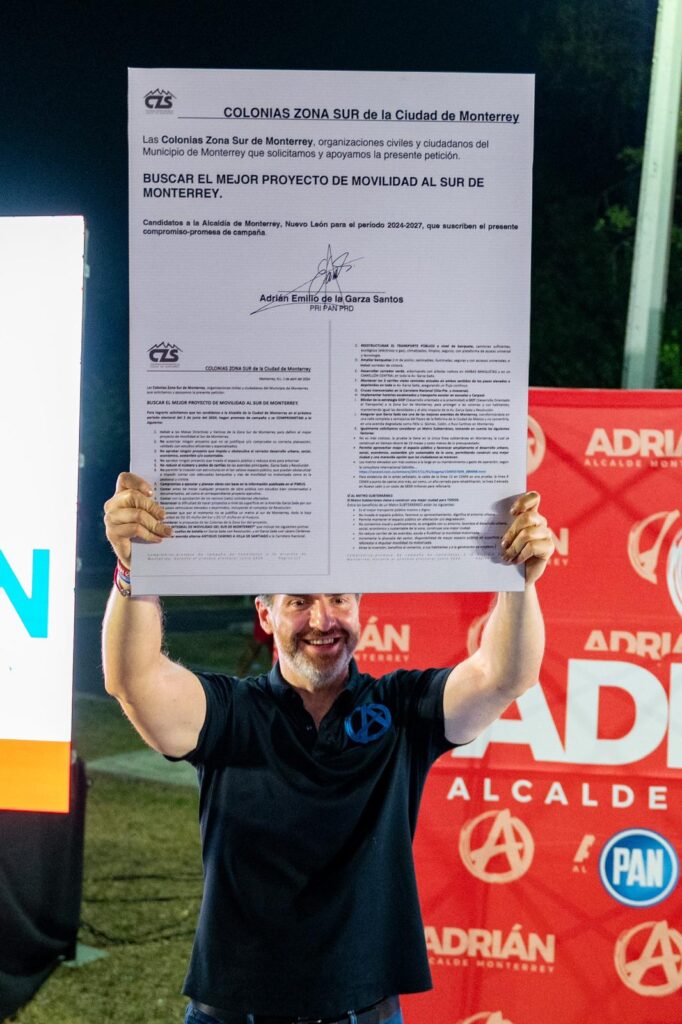 Ante representantes de 36 colonias del sur de Monterrey, el candidato a la alcaldía de esta capital, Adrián de la Garza Santos, firmó una carta compromiso para crear en conjunto un Plan Integral de Movilidad para el sector.