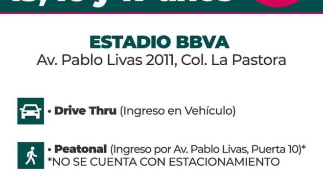 La aplicación de la vacuna será los días 5 y 6 de enero, en módulo Drive Thru del Estadio de Rayados, donde se habilitará uno más en modalidad peatonal con acceso en la Puerta 10, atendiendo a las personas de 8 de la mañana a 2 de la tarde.