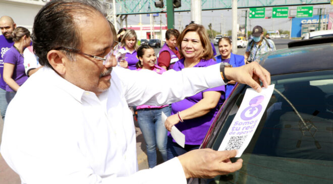 Con la colocación de calcomanías y folletos informativos, el alcalde Andrés Mijes, acompañado por personal de la Secretaría de la Mujer de Escobedo y del Instituto Estatal de las Mujeres, concientizaron a hombres y mujeres sobre la importancia de la igualdad de género.