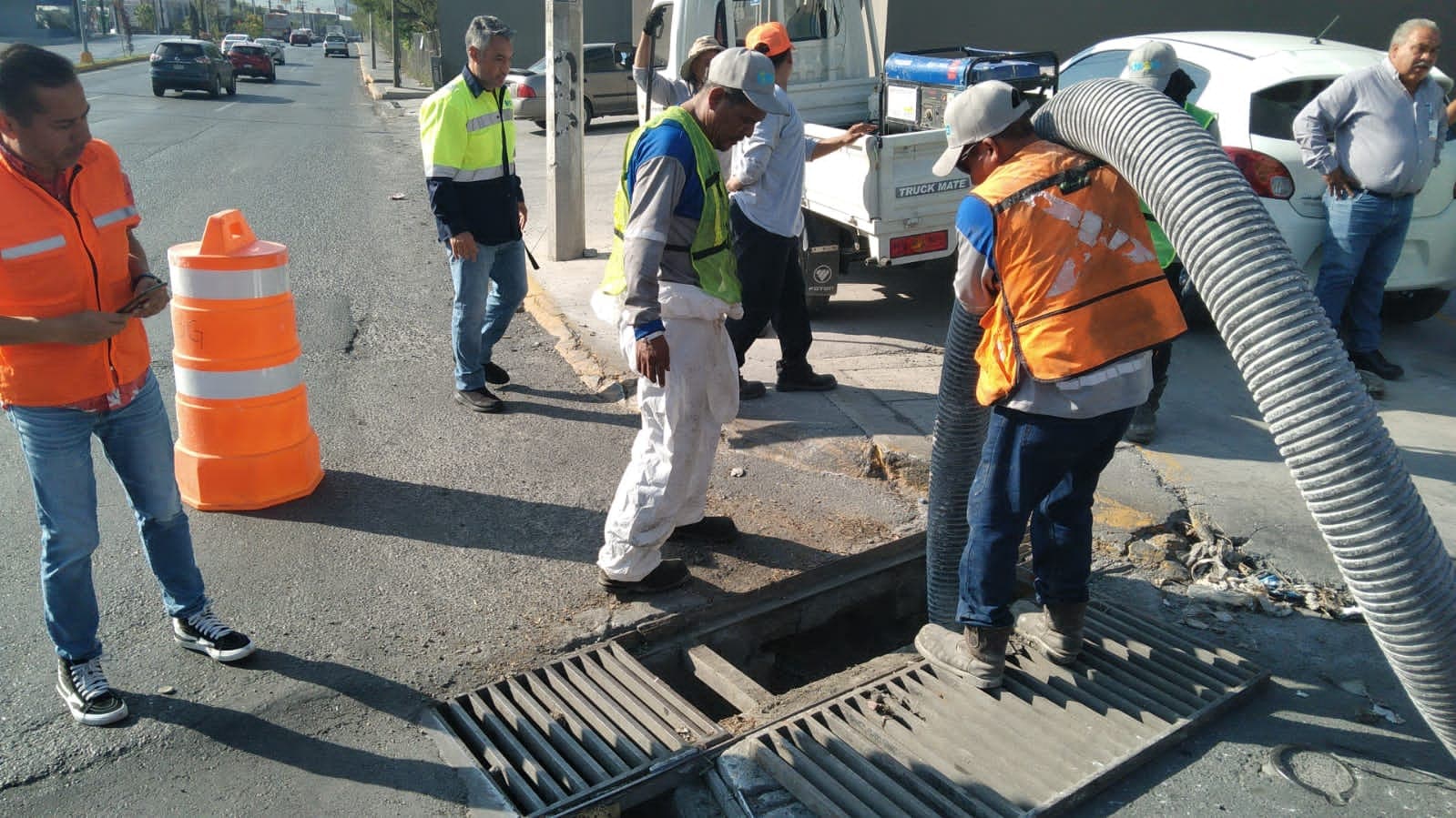 Frente a las lluvias programadas, el Alcalde de Santa Catarina, Jesús Nava Rivera, emprendió el operativo de limpieza con maquinaria, mangueras de succión y labores manuales.
